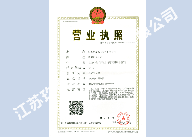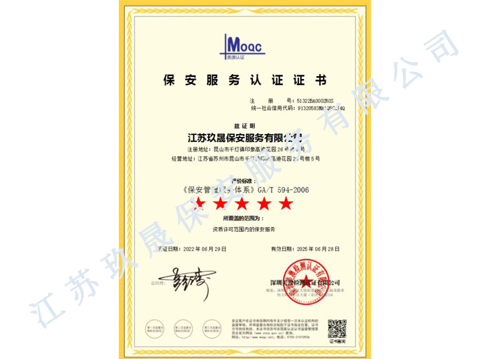 江蘇玖晟保安服務有限公司成立于江蘇省昆山市千燈鎮。注冊資金:5000萬,是擁有省公安廳頒發的保安服務許可證的企業【蘇公保服20170046】,也是昆山市保安協會常務理事單位。